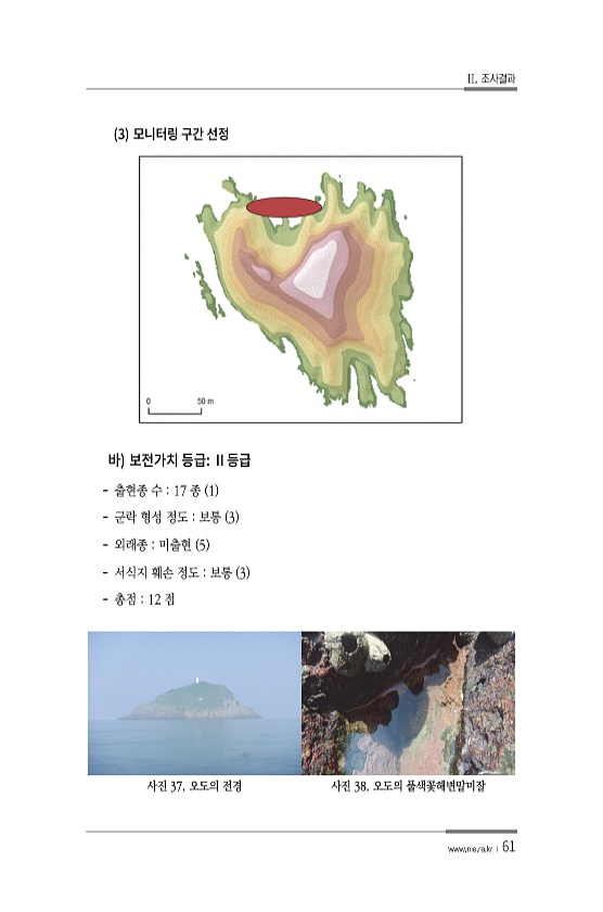 II. 조사결과 www.nie.re.kr ? 61 3 출현종 수 17 종 1 군락 형성 정도 보통 3 외래종 미출현 5 서식지 훼손 정도 보통 3 총점 12 점 사진 37. 오도의 전경 사진 38. 오도의풀색꽃해변말미잘