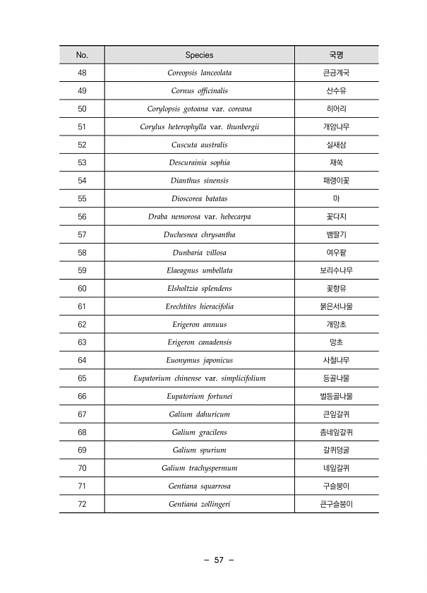 57 No. Species 국명 48 Coreopsis lanceolata 큰금계국 49 Cornus officinalis 산수유 50 Corylopsis gotoana var. coreana 히어리 51 Corylus heterophylla var. thunbergii 개암나무 52 Cuscuta australis 실새삼 53 Descurainia sophia 재쑥 54 Dianthus sinensis 패랭이꽃 55 Dioscorea batatas 마 56 Draba nemorosa var. hebecarpa 꽃다지 57 Duchesnea chrysantha 뱀딸기 58 Dunbaria villosa 여우팥 59 Elaeagnus umbellata 보리수나무 60 Elsholtzia splendens 꽃향...