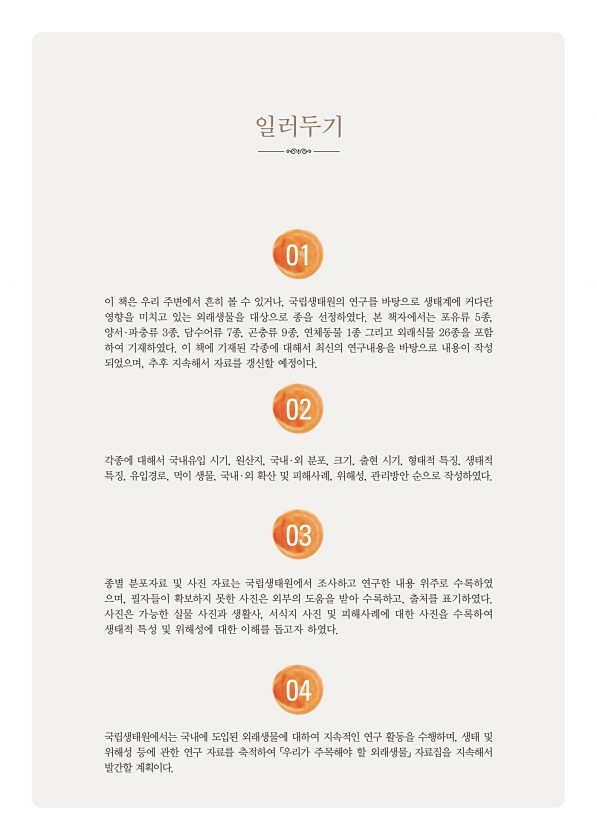 이 책은 우리 주변에서 흔히 볼 수 있거나, 국립생태원의 연구를 바탕으로 생태계에 커다란 영향을 미치고 있는 외래생물을 대상으로 종을 선정하였다. 본 책자에서는 포유류 5종, 양서·파충류 3종, 담수어류 7종, 곤충류 9종, 연체동물 1종 그리고 외래식물 26종을 포함 하여 기재하였다. 이 책에 기재된 각종에 대해서 최신의 연구내용을 바탕으로 내용이 작성 되었으며, 추후 지속해서 자료를 갱신할 예정이다. 각종에 대해서 국내유입 시기, 원산지, 국내·외 분포, 크기, 출현 시기, 형태적 특징, 생태적 특징, 유입경로, 먹이 생물, 국내·외 확산 및 피해사례, 위해성, 관리방안 순으로 작성하였다. 종별 분포자료 및 사진 자료는 국립생태원에서 조사하고 연구한 내용 위주로 수록하였 으며, 필자들이 확보하지 못한 사...