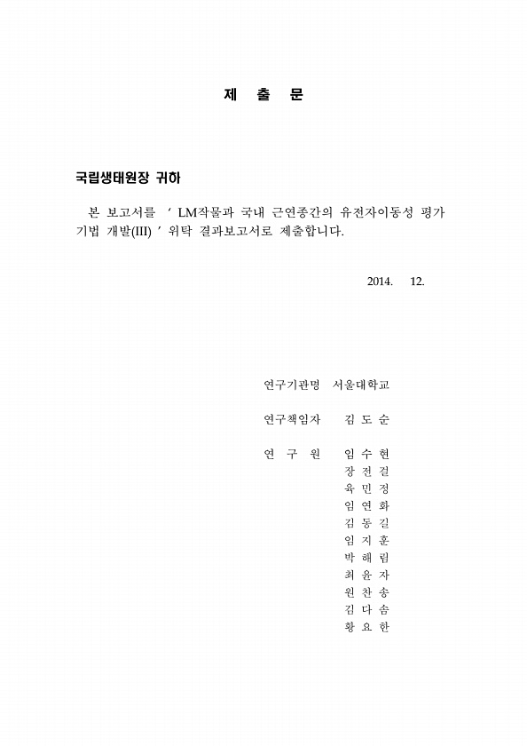 제 출 문 국립생태원장 귀하 본 보고서를 ‘ LM작물과 국내 근연종간의 유전자이동성 평가 기법 개발 III ’ 위탁 결과보고서로 제출합니다. 2014. 12. 연구기관명 서울대학교 연구책임자 김 도 순 연 구 원 임 수 현 장 전 걸 육 민 정 임 연 화 김 동 길 임 지 훈 박 해 림 최 윤 자 원 찬 송 김 다 솜 황 요한