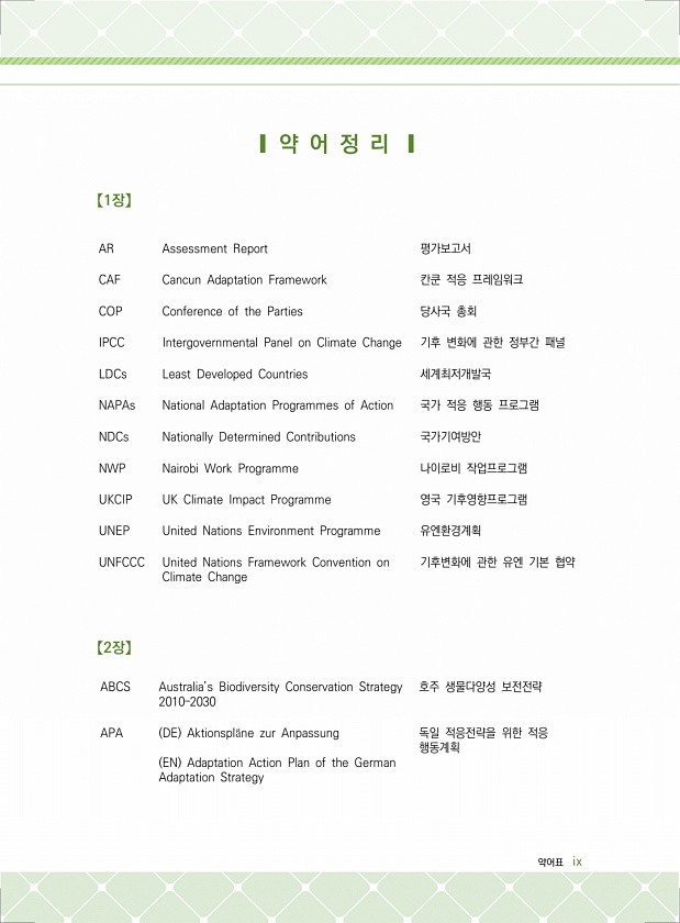 약어표 ix ? 약 어 정 리 ? 【1장】 AR Assessment Report 평가보고서 CAF Cancun Adaptation Framework 칸쿤 적응 프레임워크 COP Conference of the Parties 당사국 총회 IPCC Intergovernmental Panel on Climate Change 기후 변화에 관한 정부간 패널 LDCs Least Developed Countries 세계최저개발국 NAPAs National Adaptation Programmes of Action 국가 적응 행동 프로그램 NDCs Nationally Determined Contributions 국가기여방안 NWP Nairobi Work Programme 나이로비 작업프로그램 UKCIP UK Climate ...