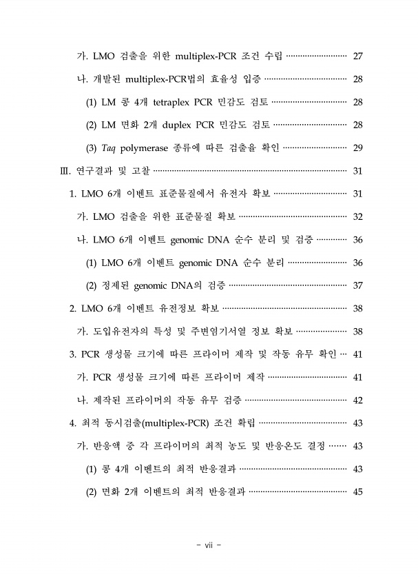 가. LMO 검출을 위한 multiplex-PCR 조건 수립 ·························· 27 나. 개발된 multiplex-PCR법의 효율성 입증 ··································· 28 1 LM 콩 4개 tetraplex PCR 민감도 검토 ································ 28 2 LM 면화 2개 duplex PCR 민감도 검토 ······························· 28 3 Taq polymerase 종류에 따른 검출율 확인 ··························· 29 Ⅲ. 연구결과 및 고찰 ·····························································...