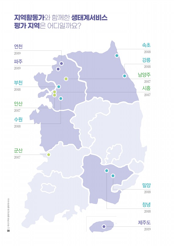 제주도 2019 지역활동가와 함께한 생태계서비스 평가 지역은 어디일까요? 강릉 2018 군산 2017 수원 2018 시흥 2017 남양주 2017 연천 2019 파주 2019 안산 2017 부천 2018 밀양 창녕 2018 2018 2018 속초 08 우리지역의 생태자산과 생태계서비스 우리지역의 생태자산과생태계서비스