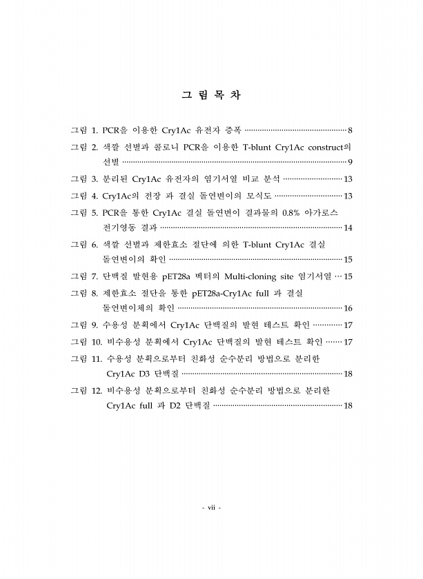 vii 그 림 목 차 그림 1. PCR을 이용한 Cry1Ac 유전자 증폭 ···············································8 그림 2. 색깔 선별과 콜로니 PCR을 이용한 T-blunt Cry1Ac construct의 선별 ·········································································································9 그림 3. 분리된 Cry1Ac 유전자의 염기서열 비교 분석 ··························· 13 그림 4. Cry1Ac의 전장 과 결실 돌연변이의 모식도 ······························· 13 그림 5. PCR을 통한 Cry...