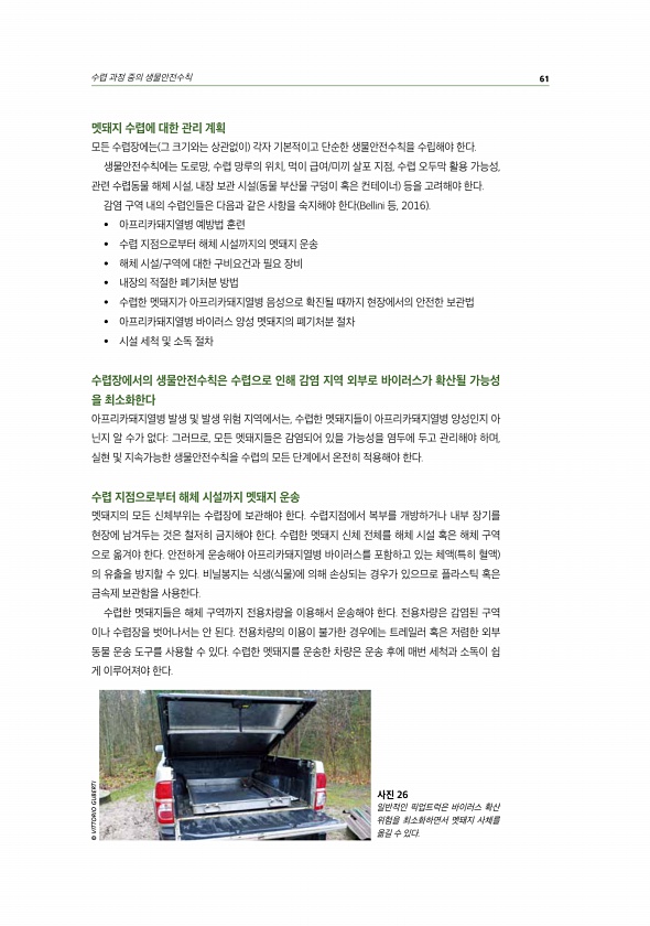 수렵 과정 중의 생물안전수칙 61 멧돼지 수렵에 대한 관리 계획 모든 수렵장에는 그 크기와는 상관없이 각자 기본적이고 단순한 생물안전수칙을 수립해야 한다. 생물안전수칙에는 도로망, 수렵 망루의 위치, 먹이 급여/미끼 살포 지점, 수렵 오두막 활용 가능성, 관련 수렵동물 해체 시설, 내장 보관 시설 동물 부산물 구덩이 혹은 컨테이너 등을 고려해야 한다. 감염 구역 내의 수렵인들은 다음과 같은 사항을 숙지해야 한다 Bellini 등, 2016 ? 아프리카돼지열병 예방법 훈련 ? 수렵 지점으로부터 해체 시설까지의 멧돼지 운송 ? 해체 시설/구역에 대한 구비요건과 필요 장비 ? 내장의 적절한 폐기처분 방법 ? 수렵한 멧돼지가 아프리카돼지열병 음성으로 확진될 때까지 현장에서의 안전한 보관법 ? 아프리카돼지열병 바이러...