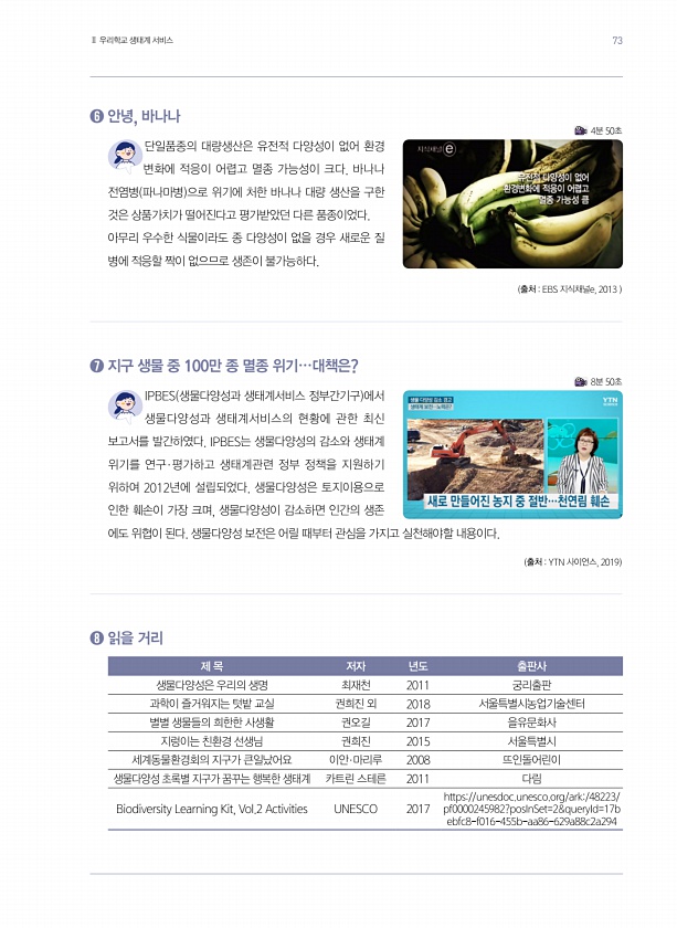 ? 안녕, 바나나 단일품종의 대량생산은 유전적 다양성이 없어 환경 변화에 적응이 어렵고 멸종 가능성이 크다. 바나나 전염병 파나마병 으로 위기에 처한 바나나 대량 생산을 구한 것은 상품가치가 떨어진다고 평가받았던 다른 품종이었다. 아무리 우수한 식물이라도 종 다양성이 없을 경우 새로운 질 병에 적응할 짝이 없으므로 생존이 불가능하다. 출처 EBS 지식채널e, 2013 ? 지구 생물 중 100만 종 멸종 위기…대책은? IPBES 생물다양성과 생태계서비스 정부간기구 에서 생물다양성과 생태계서비스의 현황에 관한 최신 보고서를 발간하였다. IPBES는 생물다양성의 감소와 생태계 위기를 연구·평가하고 생태계관련 정부 정책을 지원하기 위하여 2012년에 설립되었다. 생물다양성은 토지이용으로 인한 훼손이 가장 크며, 생...