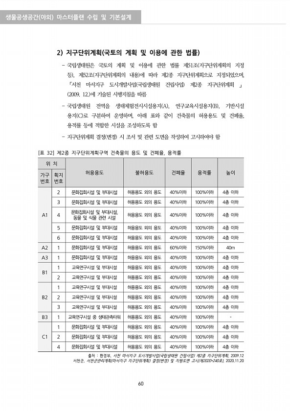 생물공생공간 야외 마스터플랜 수립 및 기본설계 60 2 지구단위계획 국토의 계획 및 이용에 관한 법률 국립생태원은 국토의 계획 및 이용에 관한 법률 제51조 지구단위계획의 지정 등 , 제52조 지구단위계획의 내용 에 따라 제2종 지구단위계획으로 지정되었으며, 「서천 마서지구 도시개발사업 국립생태원 건립사업 제2종 지구단위계획 」 2009. 12. 에 기술된 시행지침을 따름 국립생태원 전역을 생태체험전시시설용지 A , 연구교육시설용지 B , 기반시설 용지 C 로 구분하여 운영하며, 아래 표와 같이 건축물의 허용용도 및 건폐율, 용적률 등에 적합한 시설을 조성하도록 함 지구단위계획 결정 변경 시 조서 및 관련 도면을 작성하여 고시하여야 함 위 치 허용용도 불허용도 건폐율 용적률 높이 가구 번호 획지 번호 A1 ...