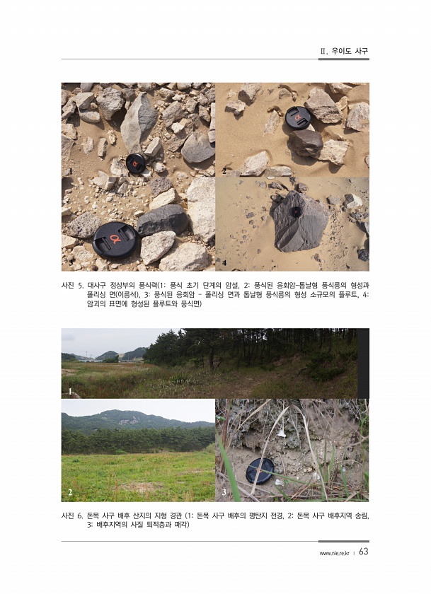 Ⅱ. 우이도 사구 www.nie.re.kr ? 63 사진 5. 대사구 정상부의 풍식력 1풍식 초기 단계의 암설, 2풍식된 응회암-톱날형 풍식릉의 형성과 폴리싱 면 이릉석 , 3풍식된 응회암 ? 폴리싱 면과 톱날형 풍식릉의 형성 소규모의 플루트, 4암괴의 표면에 형성된 플루트와 풍식면 사진 6. 돈목 사구 배후 산지의 지형 경관 1돈목 사구 배후의 평탄지 전경, 2돈목 사구 배후지역 송림, 3배후지역의 사질 퇴적층과 패각