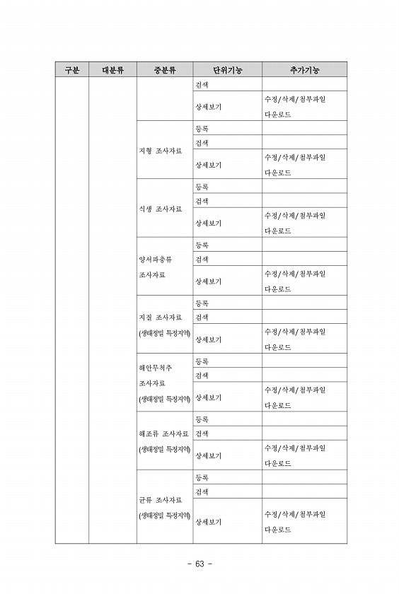 63 구분 대분류 중분류 단위기능 추가기능 검색 상세보기 수정/삭제/첨부파일 다운로드 지형 조사자료 등록 검색 상세보기 수정/삭제/첨부파일 다운로드 식생 조사자료 등록 검색 상세보기 수정/삭제/첨부파일 다운로드 양서파충류 조사자료 등록 검색 상세보기 수정/삭제/첨부파일 다운로드 지질 조사자료 생태정밀 특정지역 등록 검색 상세보기 수정/삭제/첨부파일 다운로드 해안무척추 조사자료 생태정밀 특정지역 등록 검색 상세보기 수정/삭제/첨부파일 다운로드 해조류 조사자료 생태정밀 특정지역 등록 검색 상세보기 수정/삭제/첨부파일 다운로드 균류 조사자료 생태정밀 특정지역 등록 검색 상세보기 수정/삭제/첨부파일다운로드