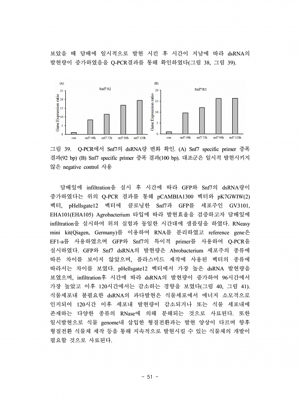 51 보았을 때 담배에 일시적으로 발현 시킨 후 시간이 지남에 따라 dsRNA의 발현량이 증가하였음을 Q-PCR결과를 통해 확인하였다 그림 38, 그림 39 그림 39. Q-PCR에서 Snf7의 dsRNA량 변화 확인. A Snf7 specific primer 증폭 결과 92 bp B Snf7 specific primer 증폭 결과 100 bp 대조군은 일시적 발현시키지 않은 negative control 사용 담배잎에 infiltration을 실시 후 시간에 따라 GFP와 Snf7의 dsRNA량이 증가하였다는 위의 Q-PCR 결과를 통해 pCAMBIA1300 벡터와 pK7GWIW 2 벡터, pHellsgate12 벡터에 클로닝한 Snf7과 GFP를 세포주인 GV3101, EHA101 EHA105 Agrob...