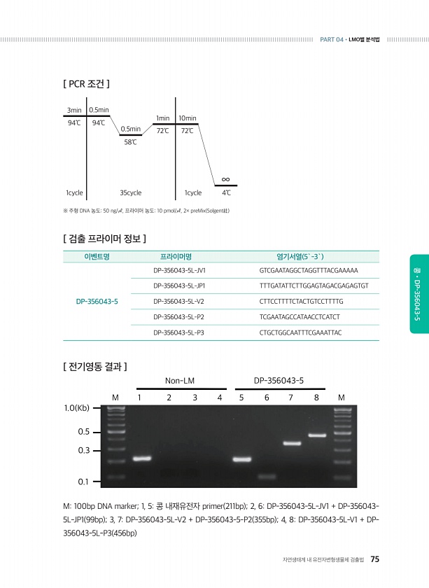 자연생태계 내 유전자변형생물체 검출법 75 PART 04?LMO별 분석법 콩?DP-356043-5 [ 검출 프라이머 정보 ] 이벤트명 프라이머명 염기서열 5`-3` DP-356043-5 DP-356043-5L-JV1 GTCGAATAGGCTAGGTTTACGAAAAA DP-356043-5L-JP1 TTTGATATTCTTGGAGTAGACGAGAGTGT DP-356043-5L-V2 CTTCCTTTTCTACTGTCCTTTTG DP-356043-5L-P2 TCGAATAGCCATAACCTCATCT DP-356043-5L-P3 CTGCTGGCAATTTCGAAATTAC M100bp DNA marker; 1, 5콩 내재유전자 primer 211bp ; 2, 6DP-356043-5L-JV1 + DP-356043- 5L-JP1 ...