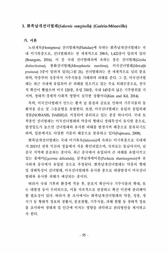 55 3. 뾰족날개선녀벌레 Salurnis marginella Gu?rin-M?neville 가. 서론 노린재목 Hemiptera 선녀벌레과 Flatidae 에 속하는 뾰족날개선녀벌레는 국 내 미기록종으로, 선녀벌레과는 전 세계적으로 298속, 1,422종이 알려져 있다 Bourgoin, 2016 이 중 국내 선녀벌레과에 속하는 종은 선녀벌레 Geisha distinctissima , 봉화선녀벌레 Mimophantia maritima , 미국선녀벌레 Metcalfa pruinosa 3종이 알려져 있다 그림 21 선녀벌레과는 전 세계적으로 널리 분포 하며, 약충부터 성충까지 기주식물을 가해하며 피해를 준다. 그 중, 미국선녀벌 레는 최근 국내에 유입되어 큰 피해를 일으키고 있는 주요 외래곤충으로, 전국 적 확...