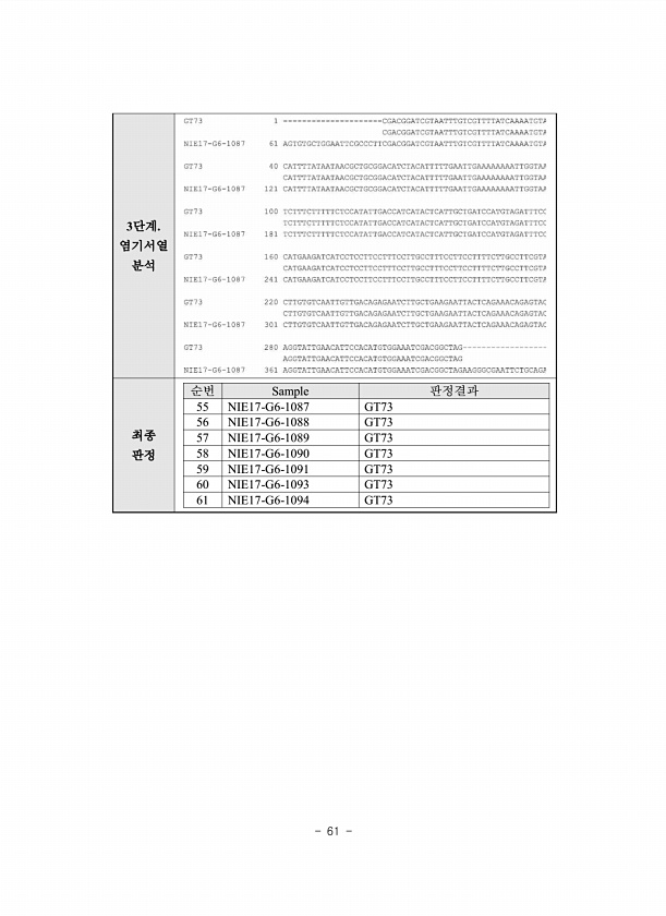 61 3단계. 염기서열 분석 최종 판정 순번 Sample 판정결과 55 NIE17-G6-1087 GT73 56 NIE17-G6-1088 GT73 57 NIE17-G6-1089 GT73 58 NIE17-G6-1090 GT73 59 NIE17-G6-1091 GT73 60 NIE17-G6-1093 GT73 61 NIE17-G6-1094GT73