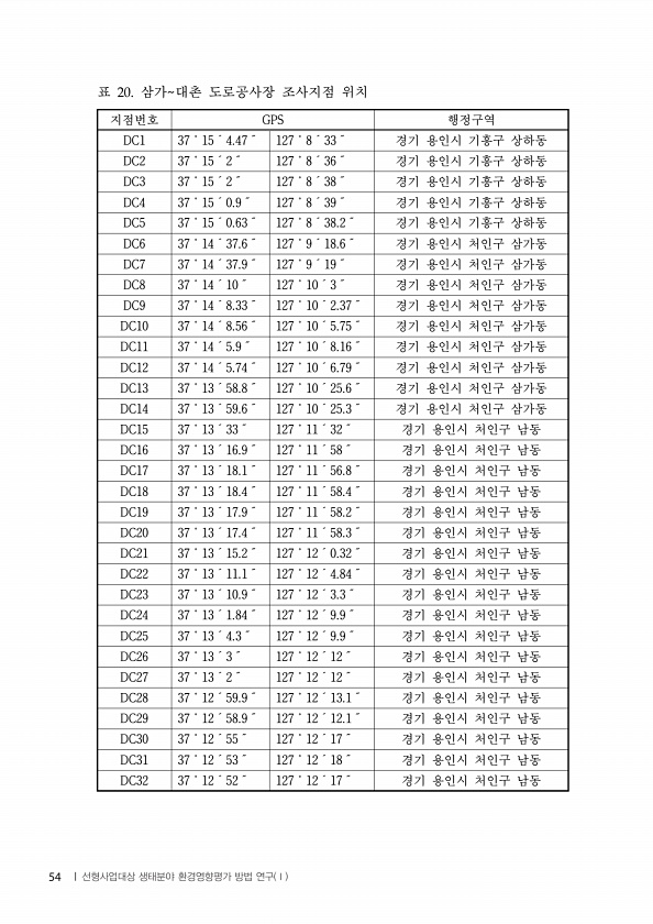 지점번호 GPS 행정구역 DC1 37˚15´4.47˝ 127˚8´33˝ 경기 용인시 기흥구 상하동 DC2 37˚15´2˝ 127˚8´36˝ 경기 용인시 기흥구 상하동 DC3 37˚15´2˝ 127˚8´38˝ 경기 용인시 기흥구 상하동 DC4 37˚15´0.9˝ 127˚8´39˝ 경기 용인시 기흥구 상하동 DC5 37˚15´0.63˝ 127˚8´38.2˝ 경기 용인시 기흥구 상하동 DC6 37˚14´37.6˝ 127˚9´18.6˝ 경기 용인시 처인구 삼가동 DC7 37˚14´37.9˝ 127˚9´19˝ 경기 용인시 처인구 삼가동 DC8 37˚14´10˝ 127˚10´3˝ 경기 용인시 처인구 삼가동 DC9 37˚14´8.33˝ 127˚10´2.37˝ 경기 용인시 처인구 삼가동 DC10 37˚14´8.56˝ 12...