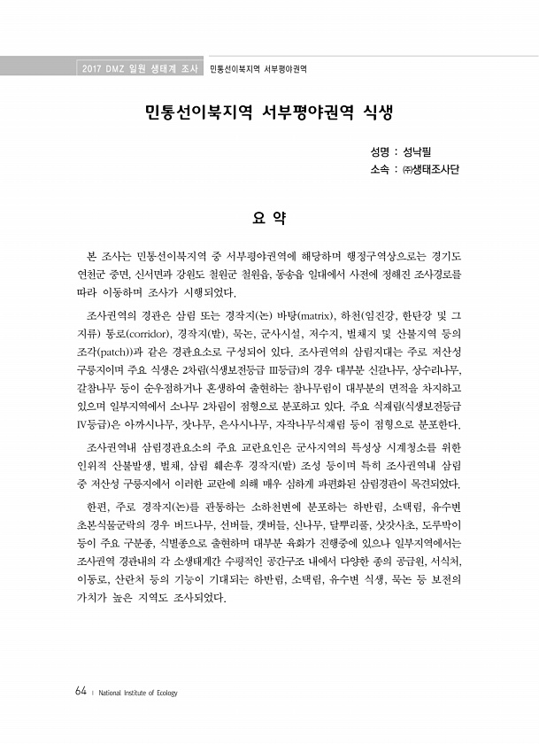 2017 DMZ 일원 생태계 조사 민통선이북지역 서부평야권역 64 ? National Institute of Ecology 민통선이북지역 서부평야권역 식생 성명 성낙필 소속 ㈜생태조사단 요 약 본 조사는 민통선이북지역 중 서부평야권역에 해당하며 행정구역상으로는 경기도 연천군 중면, 신서면과 강원도 철원군 철원읍, 동송읍 일대에서 사전에 정해진 조사경로를 따라 이동하며 조사가 시행되었다. 조사권역의 경관은 삼림 또는 경작지 논 바탕 matrix , 하천 임진강, 한탄강 및 그 지류 통로 corridor , 경작지 밭 , 묵논, 군사시설, 저수지, 벌채지 및 산불지역 등의 조각 patch 과 같은 경관요소로 구성되어 있다. 조사권역의 삼림지대는 주로 저산성 구릉지이며 주요 식생은 2차림 식생보전등급 Ⅲ등급 의 ...