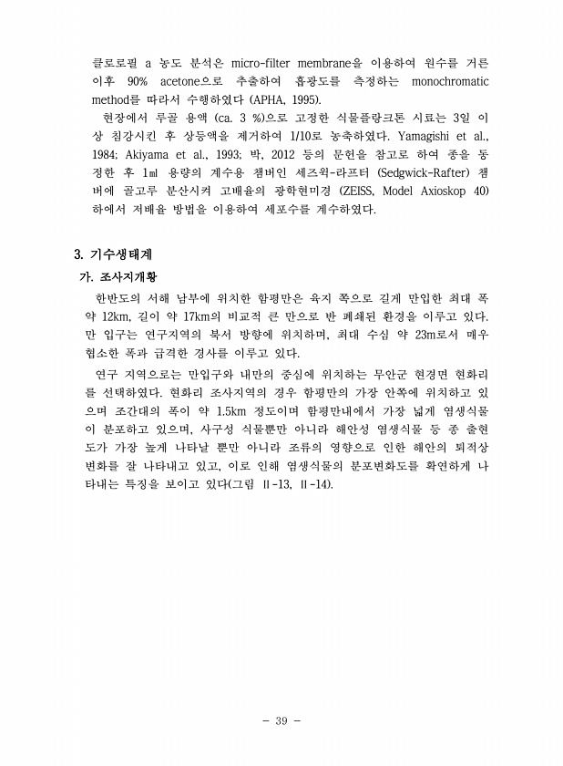 39 클로로필 a 농도 분석은 micro-filter membrane을 이용하여 원수를 거른 이후 90% acetone으로 추출하여 흡광도를 측정하는 monochromatic method를 따라서 수행하였다 APHA, 1995 현장에서 루골 용액 ca. 3 % 으로 고정한 식물플랑크톤 시료는 3일 이 상 침강시킨 후 상등액을 제거하여 1/10로 농축하였다. Yamagishi et al., 1984; Akiyama et al., 1993; 박, 2012 등의 문헌을 참고로 하여 종을 동 정한 후 1㎖ 용량의 계수용 챔버인 세즈윅-라프터 Sedgwick-Rafter 챔 버에 골고루 분산시켜 고배율의 광학현미경 ZEISS, Model Axioskop 40 하에서 저배율 방법을 이용하여 세포수를 계수하였다. 3. ...