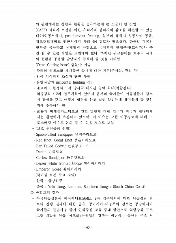 65 와 관련해서는 경험과 현황을 공유하는데 큰 도움이 될 것임 CAFF 서식지 보전을 위한 휴식지와 섭식지의 감소를 해결할 수 있는 대안 인공서식지, post-harvest feeding, 일본의 휴식지 성공사례 공유, 퀴즈랜드대학교 인공서식지 사례 등 검토가 필요했다. 한중일 각국의 현황을 공유하고 국제협력 사업으로 국제협력 관계부처 코이카 와 추 진 할 수 있는 방안을 고민해야 했다. 하이난 워크숍에는 호주의 사례 와 현황을 공유할 담당자가 참석해 줄 것을 기대함 Cross-Cutting Issue 범분야 이슈 ? 황해의 유네스코 세계유산 등재에 대한 지원 문서화, 관리 등 ? 인공 서식지의 조성과 관련 사항 ? 불법사냥과 incidental hunting 감소 ? 네트워크 활성화 각 당사국 대사관 참...