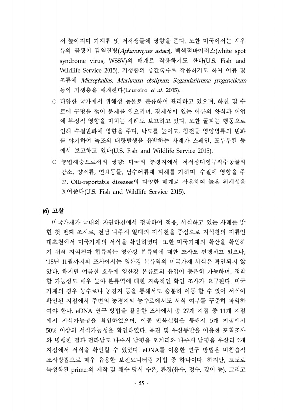 55 서 높아지며 가재류 및 저서생물에 영향을 준다. 또한 미국에서는 새우 류의 곰팡이 감염질병 Aphanomyces astaci , 백색점바이러스 white spot syndrome virus, WSSV 의 매개로 작용하기도 한다 U.S. Fish and Wildlife Service 2015 기생충의 중간숙주로 작용하기도 하여 어류 및 조류에 Microphallus, Maritrema obstipum, Sogandaritrema progeneticum 등의 기생충을 매개한다 Loureiro et al. 2015 ○ 다양한 국가에서 위해성 동물로 분류하여 관리하고 있으며, 하천 및 수 로에 구멍을 뚫어 문제를 일으키며, 경제성이 있는 어류의 양식과 어업 에 부정적 영향을 미치는 사례도 보고하고 있다. 또한...