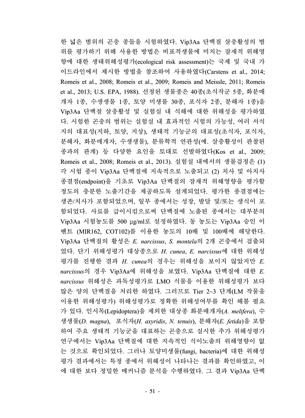 51 한 넓은 범위의 곤충 종들을 시험하였다. Vip3Aa 단백질 살충활성의 범 위를 평가하기 위해 사용한 방법은 비표적생물에 미치는 잠재적 위해영 향에 대한 생태위해성평가 ecological risk assessment 는 국제 및 국내 가 이드라인에서 제시한 방법을 참조하여 사용하였다 Carstens et al., 2014; Romeis et al., 2008; Romeis et al., 2009; Romeis and Meissle, 2011; Romeis et al., 2013; U.S. EPA, 1988 선정된 생물종은 40종 초식작군 5종, 화분매 개자 1종, 수생생물 1종, 토양 미생물 30종, 포식자 2종, 분해자 1종 을 Vip3Aa 단백질 살충활성 및 실험실 내 식해에 대한 위해성을 평가하였...