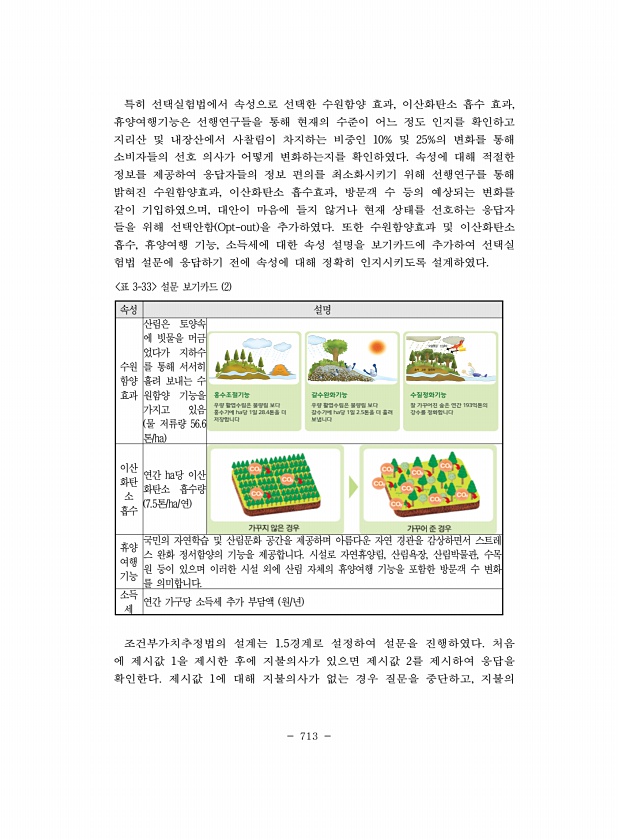 713 특히 선택실험법에서 속성으로 선택한 수원함양 효과, 이산화탄소 흡수 효과, 휴양여행기능은 선행연구들을 통해 현재의 수준이 어느 정도 인지를 확인하고 지리산 및 내장산에서 사찰림이 차지하는 비중인 10% 및 25%의 변화를 통해 소비자들의 선호 의사가 어떻게 변화하는지를 확인하였다. 속성에 대해 적절한 정보를 제공하여 응답자들의 정보 편의를 최소화시키기 위해 선행연구를 통해 밝혀진 수원함양효과, 이산화탄소 흡수효과, 방문객 수 등의 예상되는 변화를 같이 기입하였으며, 대안이 마음에 들지 않거나 현재 상태를 선호하는 응답자 들을 위해 선택안함 Opt-out 을 추가하였다. 또한 수원함양효과 및 이산화탄소 흡수, 휴양여행 기능, 소득세에 대한 속성 설명을 보기카드에 추가하여 선택실 험법 설문에 응답하기 전...