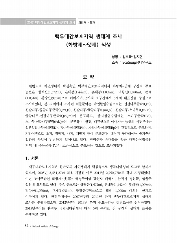 2017 백두대간보호지역 생태계 조사 화방재 댓재 64 ? National Institute of Ecology 백두대간보호지역 생태계 조사 화방재댓재 식생 성명 김호국·김지연 소속 EcoSoup생태연구소 요 약 한반도의 자연생태계 핵심축인 백두대간보호지역에서 화방재댓재 구간의 주요 능선은 함백산 1,572m , 은대봉 1,442m , 푯대봉 1,009m , 덕항산 1,070m , 큰재 1,031m , 황장산 975m 으로 이어지며, 3개의 소구간에서 5개의 대표산을 중심으로 조사하였다. 본 지역에서 조사된 식물군락은 낙엽활엽수림으로는 신갈나무군락 Qm , 신갈나무-졸참나무군락 QmQs , 신갈나무-굴참나무 QmQv , 신갈나무-소나무 QmPd , 굴참나무-신갈나무군락 QvQm 이 분포하고, 산지침엽수림에는...