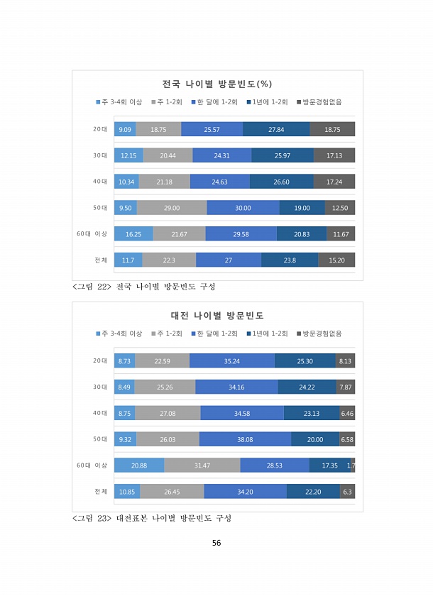 56 그림 22 전국 나이별 방문빈도 구성 그림 23 대전표본 나이별 방문빈도 구성 9.09 12.15 10.34 9.50 16.25 11.7 18.75 20.44 21.18 29.00 21.67 22.3 25.57 24.31 24.63 30.00 29.58 27 27.84 25.97 26.60 19.00 20.83 23.8 18.75 17.13 17.24 12.50 11.67 15.20 20대 30대 40대 50대 60대 이상 전체 전국 나이별 방문빈도 % 주 3-4회 이상 주 1-2회 한 달에 1-2회 1년에 1-2회 방문경험없음 8.73 8.49 8.75 9.32 20.88 10.85 22.59 25.26 27.08 26.03 31.47 26.45 35.24 34.16 34.58 38.08 28.53 ...