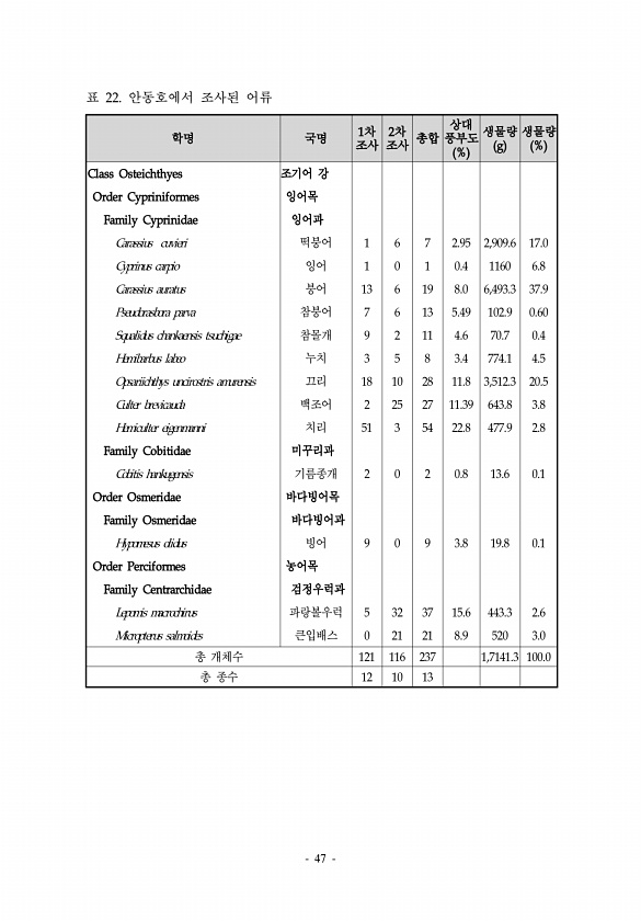 47 학명 국명 1차 조사 2차 조사 총합 상대 풍부도 % 생물량 g 생물량 % Class Osteichthyes 조기어 강 Order Cypriniformes 잉어목 Family Cyprinidae 잉어과 Carassius cuvieri 떡붕어 1 6 7 2.95 2,909.6 17.0 Cyprinus carpio 잉어 1 0 1 0.4 1160 6.8 Carassius auratus 붕어 13 6 19 8.0 6,493.3 37.9 Pseudorasbora parva 참붕어 7 6 13 5.49 102.9 0.60 Squalidus chankaensis tsuchigae 참몰개 9 2 11 4.6 70.7 0.4 Hemibarbus labeo 누치 3 5 8 3.4 774.1 4.5 Opsariichth...