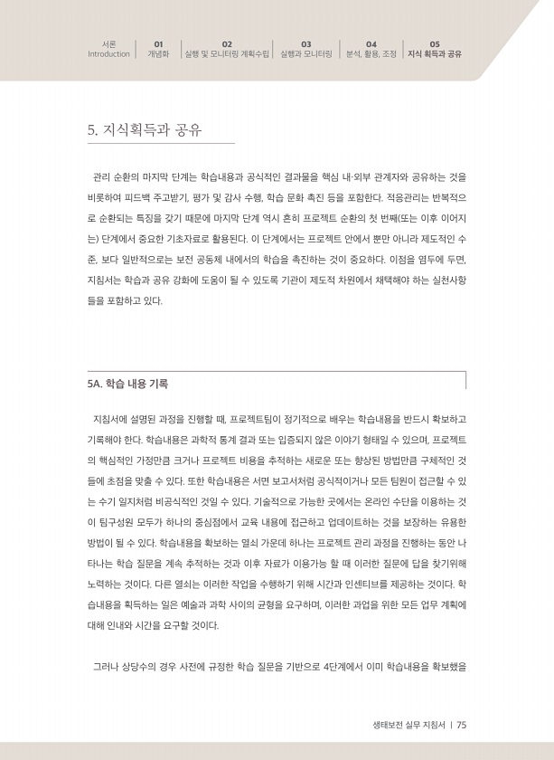 생태보전 실무 지침서 | 75 서론 Introduction 01 개념화 02 실행 및 모니터링 계획수립 03 실행과 모니터링 04 분석, 활용, 조정 05 지식 획득과 공유 관리 순환의 마지막 단계는 학습내용과 공식적인 결과물을 핵심 내·외부 관계자와 공유하는 것을 비롯하여 피드백 주고받기, 평가 및 감사 수행, 학습 문화 촉진 등을 포함한다. 적응관리는 반복적으 로 순환되는 특징을 갖기 때문에 마지막 단계 역시 흔히 프로젝트 순환의 첫 번째 또는 이후 이어지 는 단계에서 중요한 기초자료로 활용된다. 이 단계에서는 프로젝트 안에서 뿐만 아니라 제도적인 수 준, 보다 일반적으로는 보전 공동체 내에서의 학습을 촉진하는 것이 중요하다. 이점을 염두에 두면, 지침서는 학습과 공유 강화에 도움이 될 수 있도록 기관이...