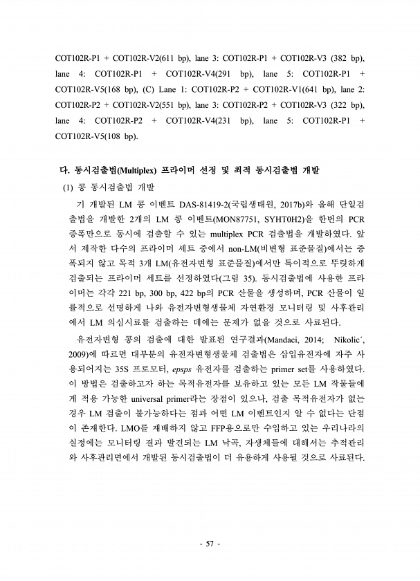 57 COT102R-P1 + COT102R-V2 611 bp , lane 3COT102R-P1 + COT102R-V3 382 bp , lane 4COT102R-P1 + COT102R-V4 291 bp , lane 5COT102R-P1 + COT102R-V5 168 bp , C Lane 1COT102R-P2 + COT102R-V1 641 bp , lane 2COT102R-P2 + COT102R-V2 551 bp , lane 3COT102R-P2 + COT102R-V3 322 bp , lane 4COT102R-P2 + COT102R-V4 231 bp , lane 5COT102R-P1 + COT102R-V5 108 bp 다. 동시검출법 Multiplex 프라이머 선정 및 최적 동시검출법 개발 1 콩 동시검출법 개...