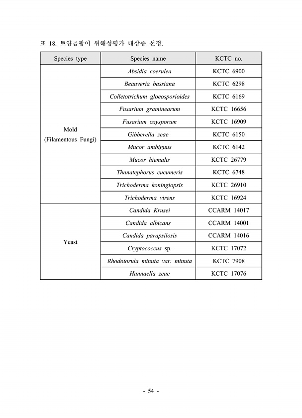 54 표 18. 토양곰팡이 위해성평가 대상종 선정. Species type Species name KCTC no. Mold Filamentous Fungi Absidia coerulea KCTC 6900 Beauveria bassiana KCTC 6298 Colletotrichum gloeosporioides KCTC 6169 Fusarium graminearum KCTC 16656 Fusarium oxysporum KCTC 16909 Gibberella zeae KCTC 6150 Mucor ambiguus KCTC 6142 Mucor hiemalis KCTC 26779 Thanatephorus cucumeris KCTC 6748 Trichoderma koningiopsis KCTC 26910 Trichod...