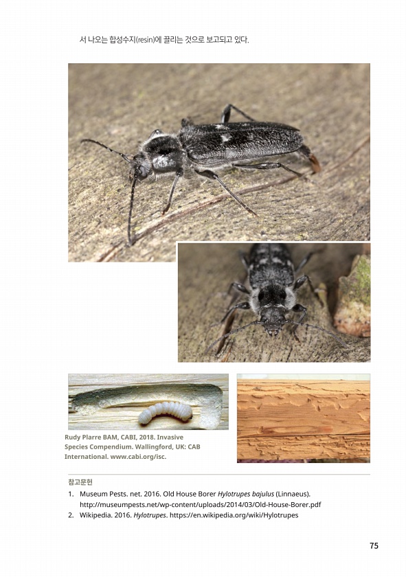 75 서 나오는 합성수지 resin 에 끌리는 것으로 보고되고 있다. 참고문헌 1. Museum Pests. net. 2016. Old House Borer Hylotrupes bajulus Linnaeus http//museumpests.net/wp-content/uploads/2014/03/Old-House-Borer.pdf 2. Wikipedia. 2016. Hylotrupes. https//en.wikipedia.org/wiki/Hylotrupes Rudy Plarre BAM, CABI, 2018. Invasive Species Compendium. Wallingford, UKCAB International.www.cabi.org/isc.