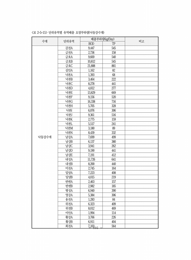 405 수계 단위유역 배출부하량 kg/Day 비고 BOD TP 낙동강수계 감천A 9,447 545 금천A 2,736 158 금호A 9,669 540 금호B 10,812 545 금호C 21,888 881 길안A 1,162 82 낙본A 1,393 68 낙본B 3,464 222 낙본C 8,278 441 낙본D 4,812 277 낙본E 13,829 669 낙본F 9,156 520 낙본G 16,338 716 낙본H 5,705 328 낙본I 6,076 306 낙본J 9,361 516 낙본K 2,775 159 낙본L 5,517 241 낙본M 3,180 89 낙본N 8,439 332 남강A 7,699 499 남강B 6,137 380 남강C 3,941 262 남강D 9,190 441 남강E 7,191 412 내성A 11,7...