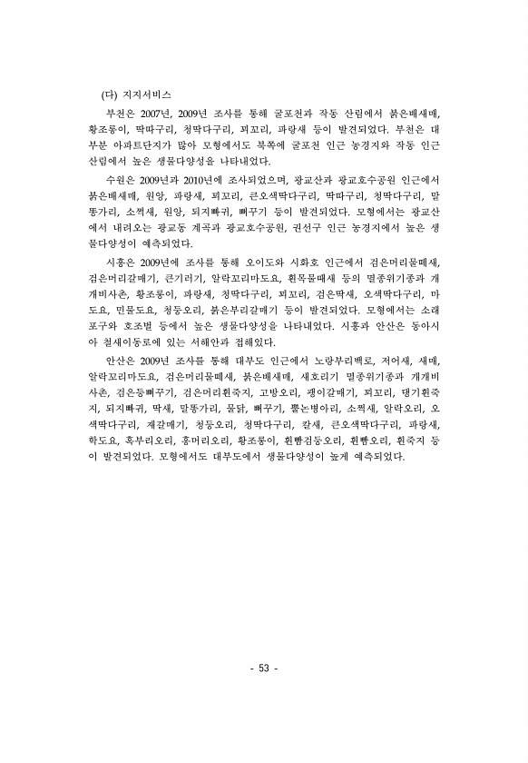 53 다 지지서비스 부천은 2007년, 2009년 조사를 통해 굴포천과 작동 산림에서 붉은배새매, 황조롱이, 딱따구리, 청딱다구리, 꾀꼬리, 파랑새 등이 발견되었다. 부천은 대 부분 아파트단지가 많아 모형에서도 북쪽에 굴포천 인근 농경지와 작동 인근 산림에서 높은 생물다양성을 나타내었다. 수원은 2009년과 2010년에 조사되었으며, 광교산과 광교호수공원 인근에서 붉은배새매, 원앙, 파랑새, 꾀꼬리, 큰오색딱다구리, 딱따구리, 청딱다구리, 말 똥가리, 소쩍새, 원앙, 되지빠귀, 뻐꾸기 등이 발견되었다. 모형에서는 광교산 에서 내려오는 광교동 계곡과 광교호수공원, 권선구 인근 농경지에서 높은 생 물다양성이 예측되었다. 시흥은 2009년에 조사를 통해 오이도와 시화호 인근에서 검은머리물떼새, 검은머리갈매기, 큰...