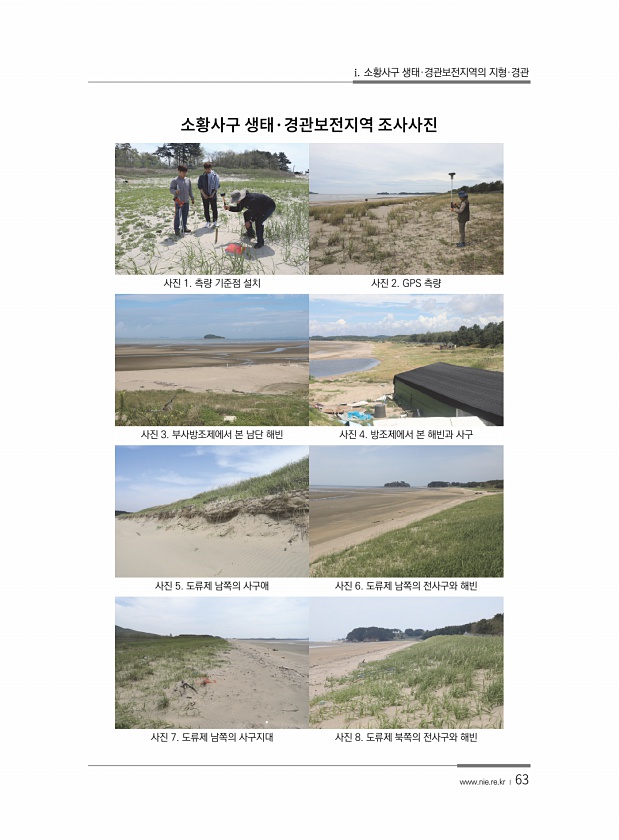 i. 소황사구 생태·경관보전지역의 지형·경관 www.nie.re.kr ? 63 사진 1. 측량 기준점 설치 사진 2. GPS 측량 사진 3. 부사방조제에서 본 남단 해빈 사진 4. 방조제에서 본 해빈과 사구 사진 5. 도류제 남쪽의 사구애 사진 6. 도류제 남쪽의 전사구와 해빈 사진 7. 도류제 남쪽의 사구지대 사진 8. 도류제 북쪽의 전사구와 해빈