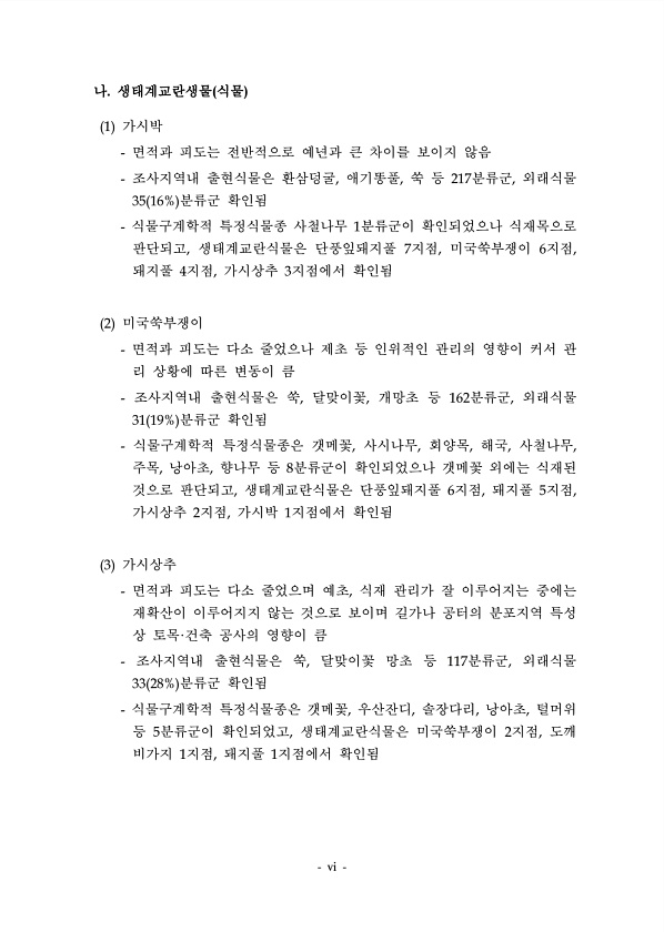 vi 나. 생태계교란생물 식물 1 가시박 면적과 피도는 전반적으로 예년과 큰 차이를 보이지 않음 조사지역내 출현식물은 환삼덩굴, 애기똥풀, 쑥 등 217분류군, 외래식물 35 16% 분류군 확인됨 식물구계학적 특정식물종 사철나무 1분류군이 확인되었으나 식재목으로 판단되고, 생태계교란식물은 단풍잎돼지풀 7지점, 미국쑥부쟁이 6지점, 돼지풀 4지점, 가시상추 3지점에서 확인됨 2 미국쑥부쟁이 면적과 피도는 다소 줄었으나 제초 등 인위적인 관리의 영향이 커서 관 리 상황에 따른 변동이 큼 조사지역내 출현식물은 쑥, 달맞이꽃, 개망초 등 162분류군, 외래식물 31 19% 분류군 확인됨 식물구계학적 특정식물종은 갯메꽃, 사시나무, 회양목, 해국, 사철나무, 주목, 낭아초, 향나무 등 8분류군이 확인되었으나 갯메꽃 ...