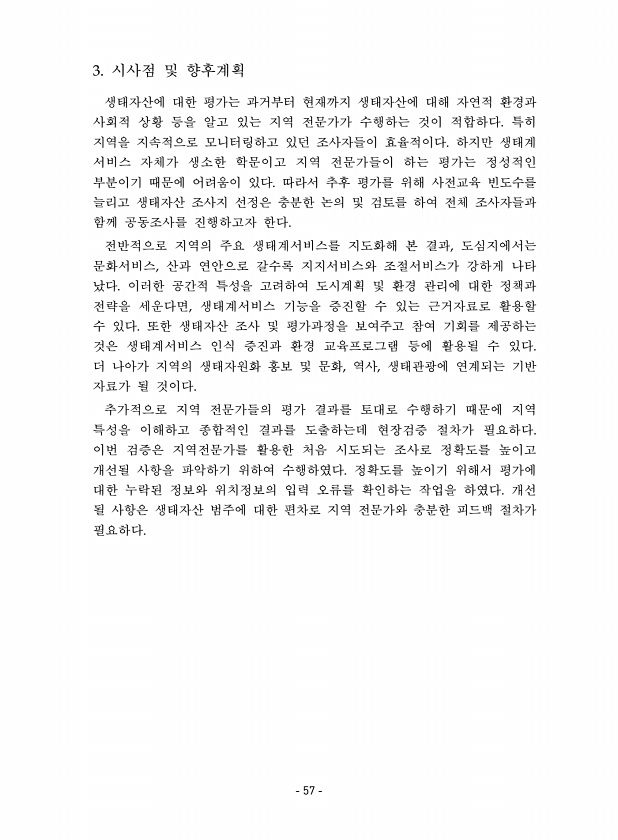 3. 시사점 및 향후계획 생태자산에 대한 평가는 과거부터 현재까지 생태자산에 대해 자연적 환경과 사회적 상황 등을 알고 있는 지역 전문가가 수행하는 것이 적합하다. 특히 지역을 지속적으로 모니터링하고 있던 조사자들이 효율적이다. 하지만 생태계 서비스 자체가 생소한 학문이고 지역 전문가들이 하는 평가는 정성적인 부분이기 때문에 어려움이 있다. 따라서 추후 평가를 위해 사전교육 빈도수를 늘리고 생태자산 조사지 선정은 충분한 논의 및 검토를 하여 전체 조사자들과 함께 공동조사를 진행하고자 한다. 전반적으로 지역의 주요 생태계서비스를 지도화해 본 결과, 도심지에서는 문화서비스, 산과 연안으로 갈수록 지지서비스와 조절서비스가 강하게 나타 났다. 이러한 공간적 특성을 고려하여 도시계획 및 환경 관리에 대한 정책과 전략...