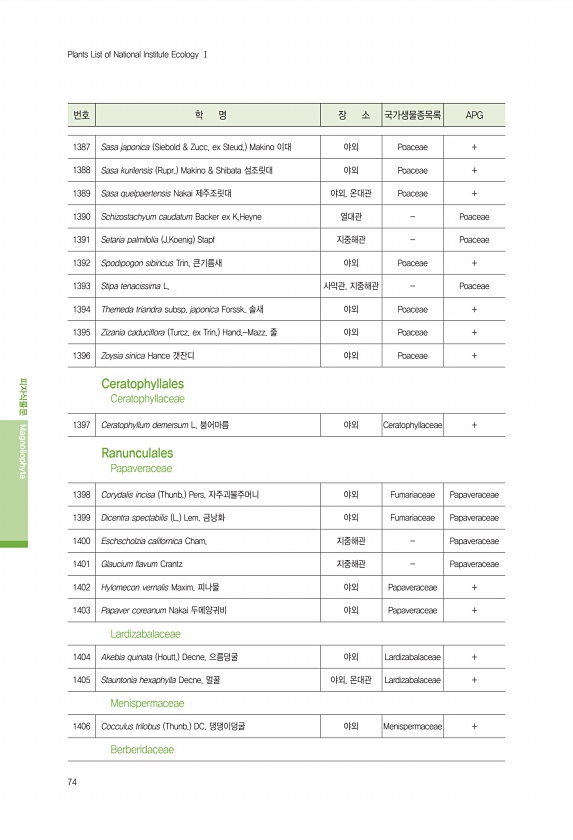74 번호 학 명 장 소 국가생물종목록 APG 피자식물문 Magnoliophyta Plants List of National Institute Ecology Ⅰ 1387 Sasa japonica Siebold & Zucc. ex Steud. Makino 이대 야외 Poaceae + 1388 Sasa kurilensis Rupr. Makino & Shibata 섬조릿대 야외 Poaceae + 1389 Sasa quelpaertensis Nakai 제주조릿대 야외, 온대관 Poaceae + 1390 Schizostachyum caudatum Backer ex K.Heyne 열대관 Poaceae 1391 Setaria palmifolia J.Koenig Stapf 지중해관 Poaceae 1392 Spodipogo...