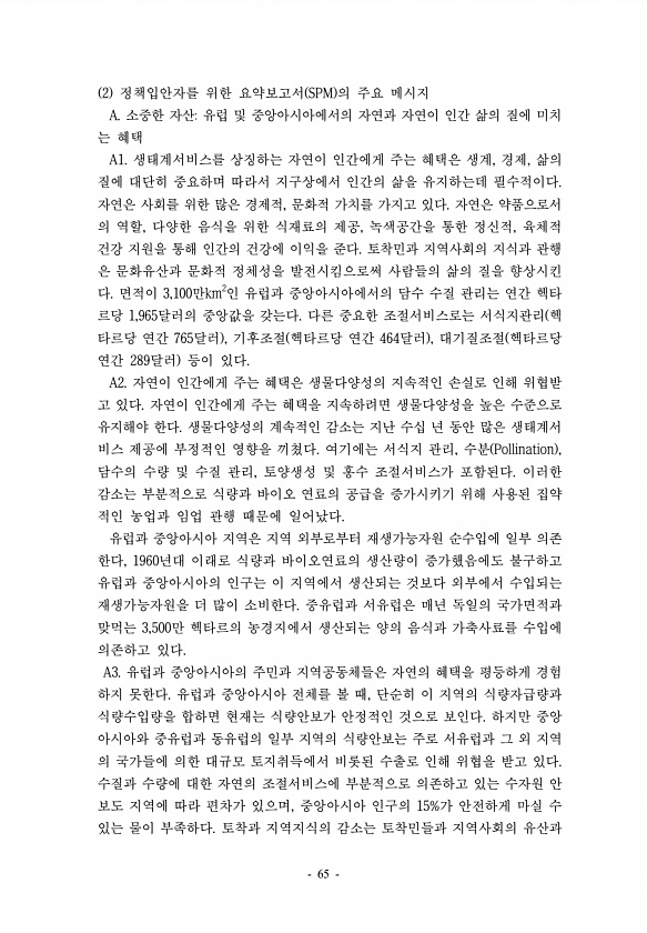 2 정책입안자를 위한 요약보고서 SPM 의 주요 메시지 A. 소중한 자산유럽 및 중앙아시아에서의 자연과 자연이 인간 삶의 질에 미치 는 혜택 A1. 생태계서비스를 상징하는 자연이 인간에게 주는 혜택은 생계, 경제, 삶의 질에 대단히 중요하며 따라서 지구상에서 인간의 삶을 유지하는데 필수적이다. 자연은 사회를 위한 많은 경제적, 문화적 가치를 가지고 있다. 자연은 약품으로서 의 역할, 다양한 음식을 위한 식재료의 제공, 녹색공간을 통한 정신적, 육체적 건강 지원을 통해 인간의 건강에 이익을 준다. 토착민과 지역사회의 지식과 관행 은 문화유산과 문화적 정체성을 발전시킴으로써 사람들의 삶의 질을 향상시킨 다. 면적이 3,100만km2인 유럽과 중앙아시아에서의 담수 수질 관리는 연간 헥타 르당 1,965달러의 중앙...