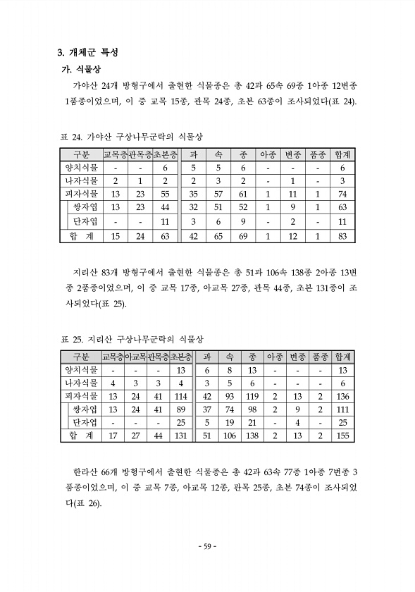 59 3. 개체군 특성 가. 식물상 가야산 24개 방형구에서 출현한 식물종은 총 42과 65속 69종 1아종 12변종 1품종이었으며, 이 중 교목 15종, 관목 24종, 초본 63종이 조사되었다 표 24M. 구분 교목층관목층초본층 과 속 종 아종 변종 품종 합계 양치식물 6 5 5 6 6 나자식물 2 1 2 2 3 2 1 3 피자식물 13 23 55 35 57 61 1 11 1 74 쌍자엽 13 23 44 32 51 52 1 9 1 63 단자엽 11 3 6 9 2 11 합 계 15 24 63 42 65 69 1 12 1 83 표 24. 가야산 구상나무군락의 식물상 지리산 83개 방형구에서 출현한 식물종은 총 51과 1A6속 138종 2아종 13변 종 2품종이었으며, 이 중 교목 17종, 아교목 27종, 관목...