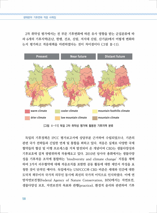 생태분야 기후변화 적응 사례집 58 2차 취약성 평가에서는 전 부문 기후변화에 따른 유사 영향을 받는 군집분류에 따 라 6개의 기후지역 온난, 한랭, 건조, 산림, 저지대 산림, 산기슭 에서 어떻게 변화하 는지 평가하고 적응대책을 마련하였다는 것이 차이점이다 그림 Ⅱ?11 [그림 Ⅱ-11] 독일 2차 취약성 평가에 활용된 기후지역 분류 독일의 기후정책은 IPCC 평가보고서에 상당부분 근거하여 수립되었으나, 기존의 관련 국가 전략들과 긴밀한 연계 및 통합을 꾀하고 있다. 적응은 실제로 다양한 국제 협약들의 협상 및 이행 프로세스를 거쳐 발전되어 온 개념이며 CBD는 생물다양성과 기후보호에 걸쳐 광범위하게 작용해오고 있다. 2010년 당사국 총회에서는 생물다양 성을 기후적응 조치에 통합하는 ‘biodiversi...
