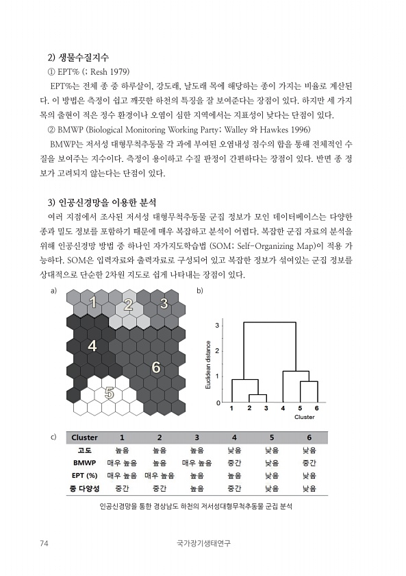 74 국가장기생태연구 2 생물수질지수 ① EPT% ; Resh 1979 EPT%는 전체 종 중 하루살이, 강도래, 날도래 목에 해당하는 종이 가지는 비율로 계산된 다. 이 방법은 측정이 쉽고 깨끗한 하천의 특징을 잘 보여준다는 장점이 있다. 하지만 세 가지 목의 출현이 적은 정수 환경이나 오염이 심한 지역에서는 지표성이 낮다는 단점이 있다. ② BMWP Biological Monitoring Working Party; Walley 와 Hawkes 1996 BMWP는 저서성 대형무척추동물 각 과에 부여된 오염내성 점수의 합을 통해 전체적인 수 질을 보여주는 지수이다. 측정이 용이하고 수질 판정이 간편하다는 장점이 있다. 반면 종 정 보가 고려되지 않는다는 단점이 있다. 3 인공신경망을 이용한 분석 여러 지점에...