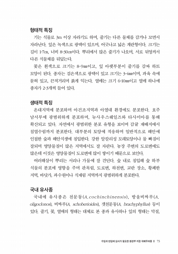 수입과 반입에 심사가 필요한 환경부 지정 위해우려종 Ⅱ 75 형태적 특징 기는 식물로 3m 이상 자라기도 하며, 줄기는 다른 물체를 감거나 꼬면서 자라난다. 잎은 녹색으로 광택이 있으며, 어긋나고 넓은 계란형이다. 크기는 길이 1-7㎝, 너비 8-30㎝이다. 뿌리에서 많은 줄기가 나오며, 서로 뒤엉켜서 다른 식물체를 뒤덮는다. 꽃은 흰색으로 크기는 8-9㎜이고, 잎 아랫부분이 줄기를 감싸 하트 모양이 된다. 종자는 검은색으로 광택이 있고 크기는 3-4㎜이며, 과육 속에 묻혀 있고, 끈적거리며 붉게 익는다. 열매는 크기 6-10㎜이고 열매 하나에 종자가 2-3개씩 들어 있다. 생태적 특징 온대지역에 분포하며 아건조지역과 아열대 환경에도 분포한다. 호주 남서부에 광범위하게 분포하며, 뉴사우스웨일즈와 타사미아를 ...
