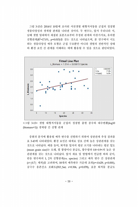 59 그림 3-13은 2014년 10월에 조사된 서천갯벌 대형저서동물 군집의 정점별 생물다양성과 생체량 관계를 나타낸 것이다. 두 변수는, 앞서 우리나라 서, 남해 갯벌 일대에서 채집된 표본으로부터 추정된 관계와 마찬가지로, 유의한 선형관계 R2=17.0%, p=0.015 를 갖는 것으로 나타났으며, 본 연구에서 시도 하는 생물다양성 예측 모형은 군집 구조뿐만 아니라 갯벌의 전반적인 상태 와 환경 요인 간 관계를 이해하는 데에 활용될 수 있을 것으로 판단되었다. 그림 3-13 갯벌 대형저서동물 군집의 정점별 출현 종수와 대수변환 log10 biomass+1 생체량 간 선형 관계 중회귀 분석에 활용될 예측 변수를 선별하기 위하여 상관관계 추정 결과를 표 3-43에 나타내었다. 환경 요인은 대체로 상호 간에 높...