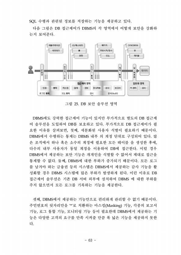 SQL 수행과 관련된 정보를 저장하는 기능을 제공하고 있다. 다음 그림은 DB 접근제어가 DBMS의 각 영역에서 어떻게 보안을 강화하 는지 보여준다. 그림 25. DB 보안 솔루션 영역 DBMS에도 강력한 접근제어 기능이 있지만 부가적으로 별도의 DB 접근제 어 솔루션을 도입하여 DB를 보호하고 있다. 부가적으로 DB 접근제어가 필 요한 이유를 살펴보면, 첫째, 세분화된 사용자 식별이 필요하기 때문이다. DBMS에서 수행하는 통제는 DBMS 내부 의 계정 단위로 구성되어 있다. 많 은 조직에서 하나 혹은 소수의 계정에 필요한 모든 테이블 을 생성한 후에, 다수의 내부 사용자가 동일 계정을 이용하여 DB에 접근한다. 이럴 경우 DBMS에서 제공하는 보안 기능은 개개인을 식별할 수 없어서 제대로 접근을 통제할 ...