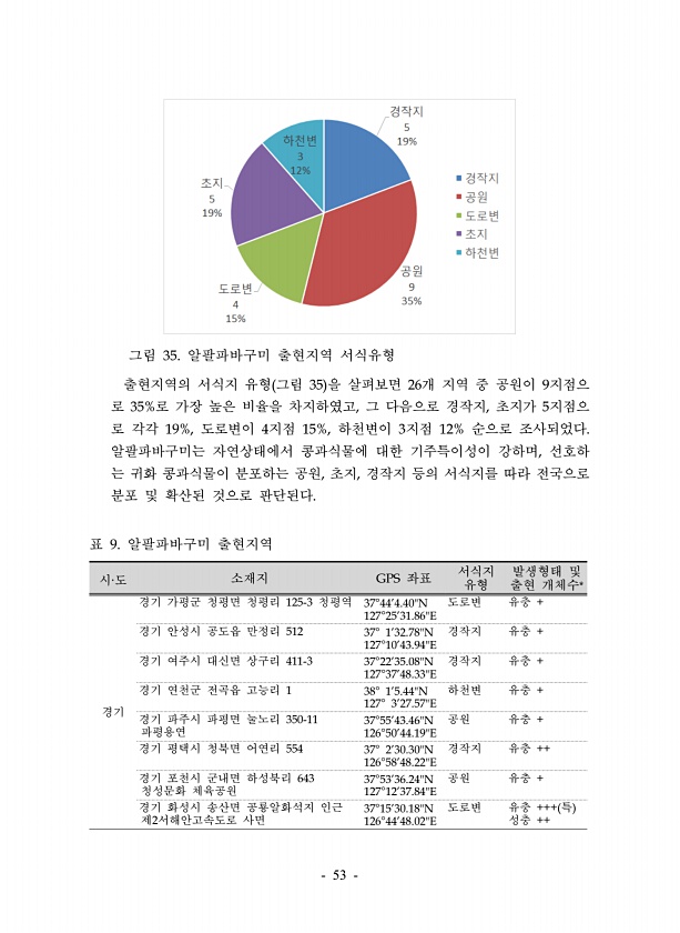53 시·도 소재지 GPS 좌표 서식지 유형 출현 개체수 발생형태 및* 경기 경기 가평군 청평면 청평리 125-3 청평역 37°444.40N 127°2531.86E 도로변 유충 + 경기 안성시 공도읍 만정리 512 37° 132.78N 127°1043.94E 경작지 유충 + 경기 여주시 대신면 상구리 411-3 37°2235.08N 127°3748.33E 경작지 유충 + 경기 연천군 전곡읍 고능리 1 38° 15.44N 127° 327.57E 하천변 유충 + 경기 파주시 파평면 눌노리 350-11 파평용연 37°5543.46N 126°5044.19E 공원 유충 + 경기 평택시 청북면 어연리 554 37° 230.30N 126°5848.22E 경작지 유충 ++ 경기 포천시 군내면 하성북리 643 청성문화 체육...