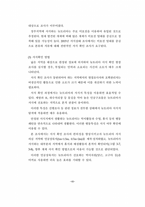-48- 대상으로 조사가 이루어졌다. 청주지역에 서식하는 뉴트리아는 주로 미호천을 이용하여 유입된 것으로 추정된다. 현재 발견된 개체에 비해 많은 개체가 미호천 일대를 중심으로 정 착해 있을 가능성이 높다. 2015년 서식실태 조사에서는 미호천 일대를 중심 으로 본류와 지류에 대해 전반적인 서식 확인 조사가 요구된다. 3 서식확인 방법 넓은 지역을 대상으로 한정된 정보에 의지하여 뉴트리아 서식 확인 현장 조사를 실시할 경우, 투입되는 인력과 소요되는 시간의 소모가 매우 크게 나타난다. 서식 확인 조사가 동반되어야 하는 지역에서의 현장조사자와 포획관리자는 비생산적인 활동으로 인한 소모가 크기 때문에 이를 개선하기 위한 노력이 필요하다. 서식 확인 과정에서는 뉴트리아의 서식지 특성을 이용하면 효율적일 수 있다....