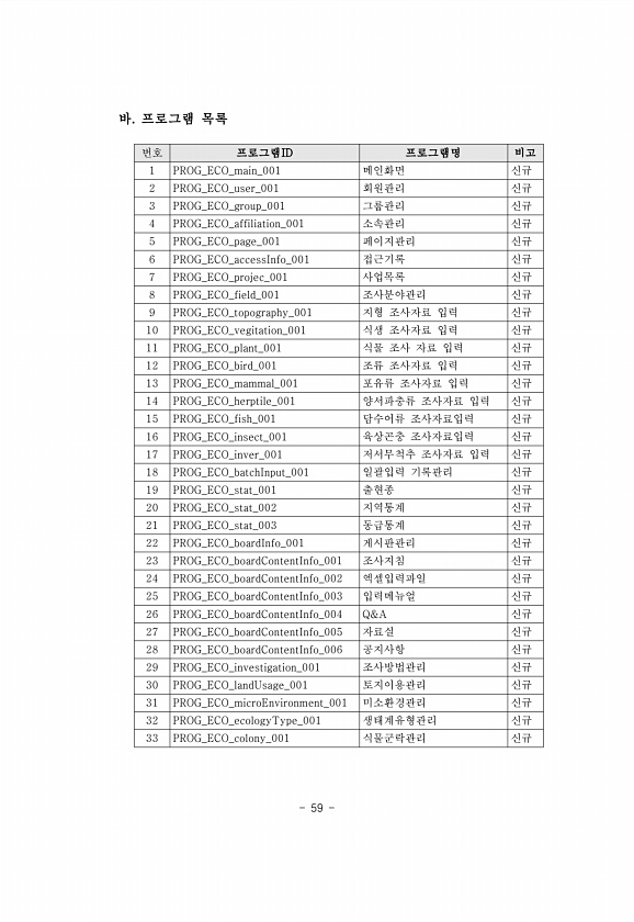 59 번호 프로그램ID 프로그램명 비고 1 PROG_ECO_main_001 메인화면 신규 2 PROG_ECO_user_001 회원관리 신규 3 PROG_ECO_group_001 그룹관리 신규 4 PROG_ECO_affiliation_001 소속관리 신규 5 PROG_ECO_page_001 페이지관리 신규 6 PROG_ECO_accessInfo_001 접근기록 신규 7 PROG_ECO_projec_001 사업목록 신규 8 PROG_ECO_field_001 조사분야관리 신규 9 PROG_ECO_topography_001 지형 조사자료 입력 신규 10 PROG_ECO_vegitation_001 식생 조사자료 입력 신규 11 PROG_ECO_plant_001 식물 조사 자료 입력 신규 12 PROG_ECO_bird...