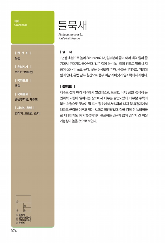 074 ① ② ③ ④ ① 들묵새 ② 생육지 공터 ③ 생육지 초지 ④ 분포도 | 생 태 | 1년생 초본으로 높이 30∼50cm이며, 밑부분이 굽고 여러 개의 잎이 줄 기에서 무더기로 붙어난다. 잎은 길이 5∼15cm이며 안으로 말려서 지 름이 0.5∼1mm로 된다. 꽃은 5∼6월에 피며, 수술은 1개이고, 자방에 털이 없다. 유럽 남부 원산으로 중부 이남의 바닷가 양지쪽에서 자란다. | 분포현황 | 제주도 전체 여러 지역에서 발견되었고, 도로변, 나지, 공원, 경작지 등 인위적 교란이 일어나는 장소에서 대부분 발견되었다. 대부분 수목이 없는 환경으로 햇볕이 잘 드는 장소에서 서식하며, 나지 및 휴경지에서 대규모 군락을 이루고 있는 것으로 확인되었다. 작물 경작 전 녹비작물 로 재배하기도 하여 휴경지에서 분포하...