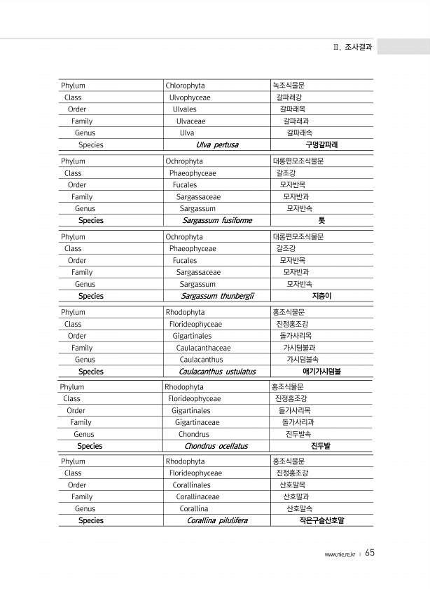 Ⅱ. 조사결과 www.nie.re.kr ? 65 Phylum Chlorophyta 녹조식물문 Class Ulvophyceae 갈파래강 Order Ulvales 갈파래목 Family Ulvaceae 갈파래과 Genus Ulva 갈파래속 Species Ulva pertusa 구멍갈파래 Phylum Ochrophyta 대롱편모조식물문 Class Phaeophyceae 갈조강 Order Fucales 모자반목 Family Sargassaceae 모자반과 Genus Sargassum 모자반속 Species Sargassum fusiforme 톳 Phylum Ochrophyta 대롱편모조식물문 Class Phaeophyceae 갈조강 Order Fucales 모자반목 Family Sargassaceae 모자반과 Gen...