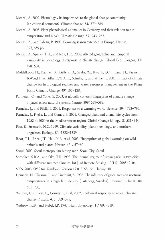 74 국가장기생태연구 Menzel, A. 2002. Phenology Its importance to the global change community an editorial comment Climate change. 54379-385. Menzel, A. 2003. Plant phenological anomalies in Germany and their relation to air temperature and NAO. Climatic Change. 57243-263. Menzel, A., and Fabian, P. 1999. Growing season extended in Europe. Nature. 397, 659 pp. Menzel, A., Sparks, T.H., and Roy, D.B. 2006. ...